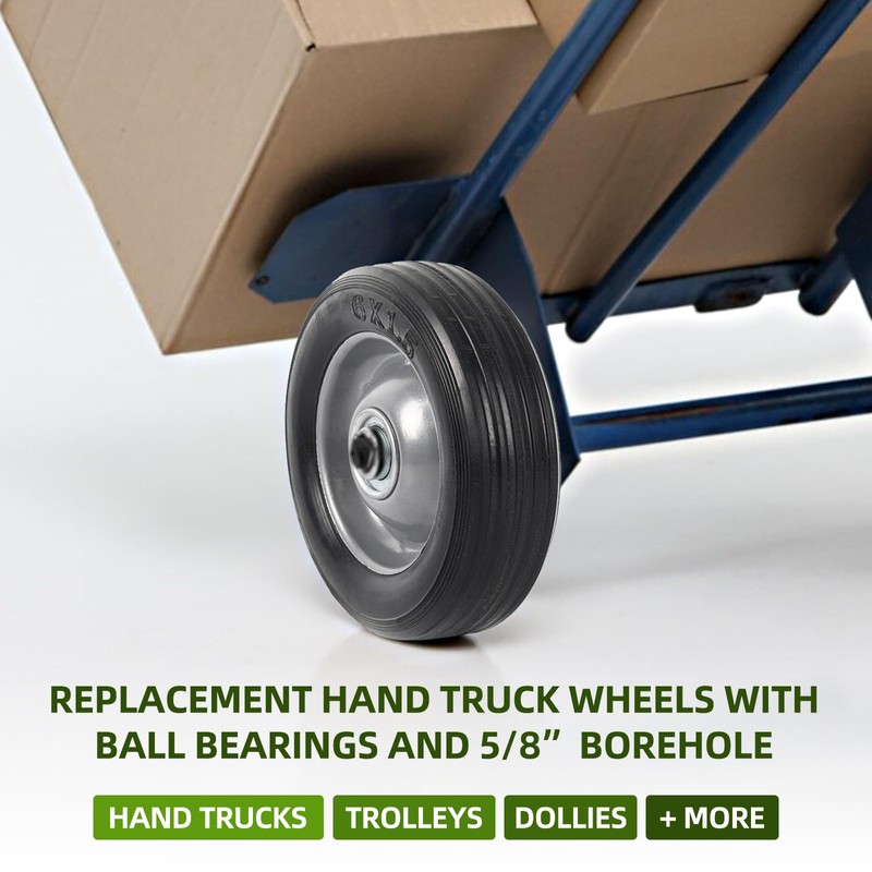• REPLACEMENT HAND TRUCK WHEELS WITH BALL BEARINGS AND 5/8” BOREHOLE DIAMETER - Wheel assemblies for hand trucks and garden carts come in different sizes, but these 6-inch tires and wheels are one of the most common sizes for hand trucks, trolleys, dollies, and wheeled garden equipment. They are suitable for a 5/8-inch axle shaft that requires a 1.3 inches centered hub. Double-sealed bearings allow for minimal rotation friction for better maneuverability.