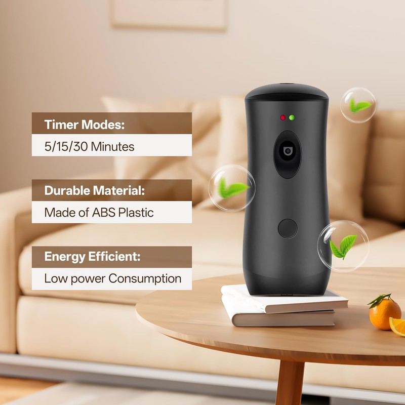 - DURABLE & ECO-FRIENDLY MATERIAL – Crafted from sturdy ABS material, these automatic air freshener dispensers are odor-free and built to last. Features include two LED indicators, three adjustable timer settings (5, 15, 30 minutes), and a convenient manual spray button