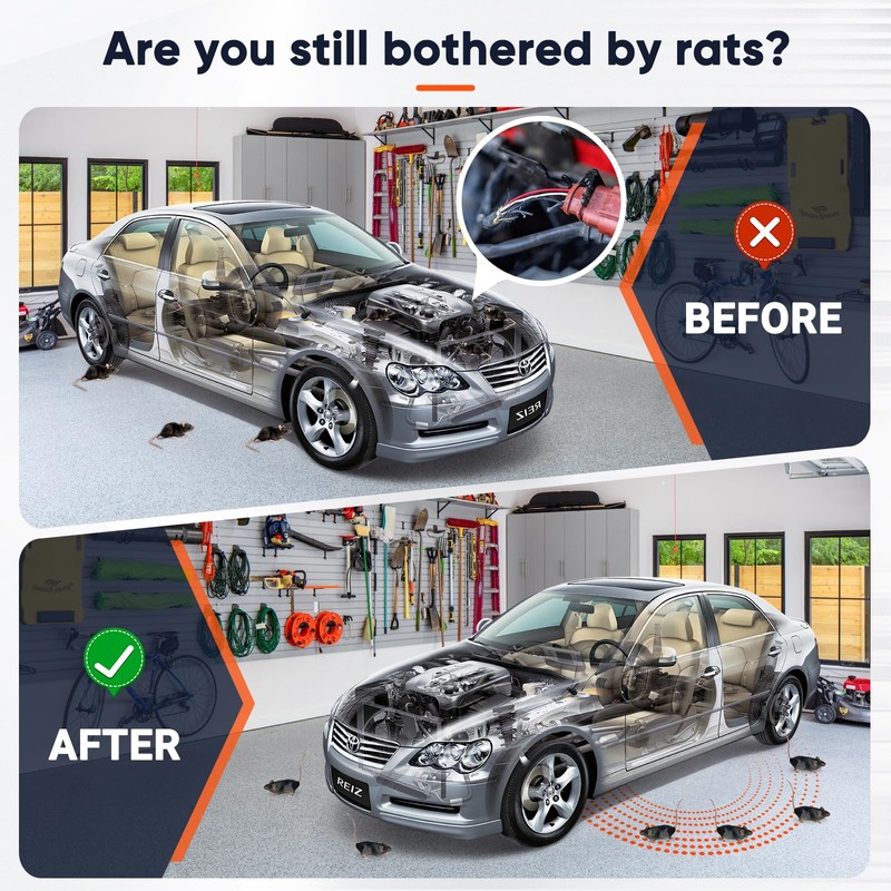 - DURABLE & PET-FRIENDLY DESIGN: Crafted from tough, odor-free, and chemical-free materials, this rodent repeller is completely safe for your family and pets. It’s built to withstand high heat, cold, and rugged environments under the hood—delivering reliable, long-term defense against rats, mice, and other unwanted critters