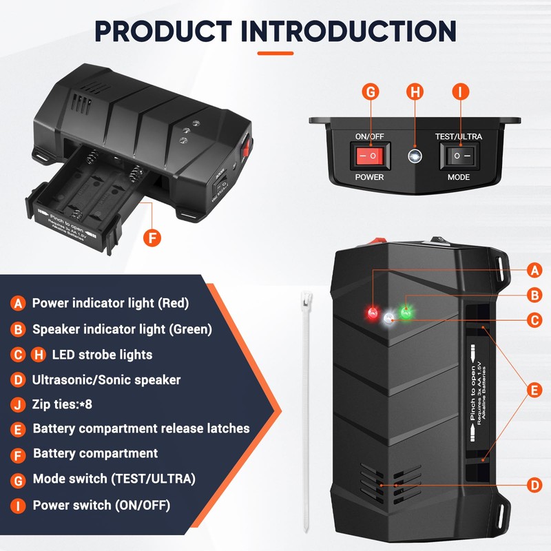 - ADVANCED RODENT GUARD: Protect your vehicle the smart way with this powerful car rodent deterrent that emits high-pitched ultrasonic noise paired with pulsating strobe lights. Ideal for use under the hood, it creates a harsh environment for rodents, chipmunks, and squirrels—helping stop wire-chewing damage before it starts