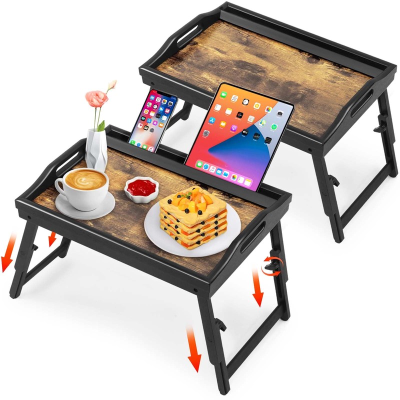 2 Pack Bed Tray Table with Adjustable Legs Breakfast Trays Serving Tray Bamboo Bed Laptap Floding Legs with Handles and Phone Holders