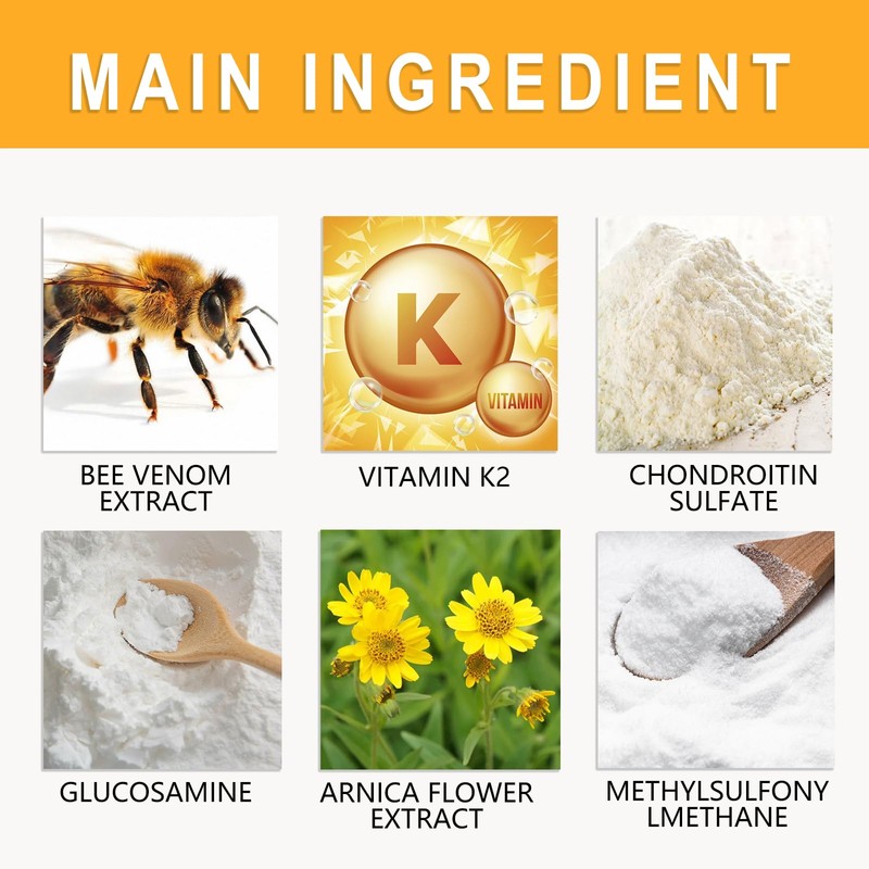 - Prdouct Ingredients: Arnica Flower Extract, Bee Venom Extract, Glucosamine, Vitamin K2, Chondroitin Sulfate.