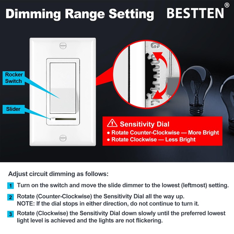 • Adjuster Dial: Ensures compatibility with almost all dimmable LED, CFL, incandescent and halogen bulbs, up to 150 watts of dimmable LED/CFL lamps or 600 watts of incandescent bulbs, min. Load for LED lights: 3W