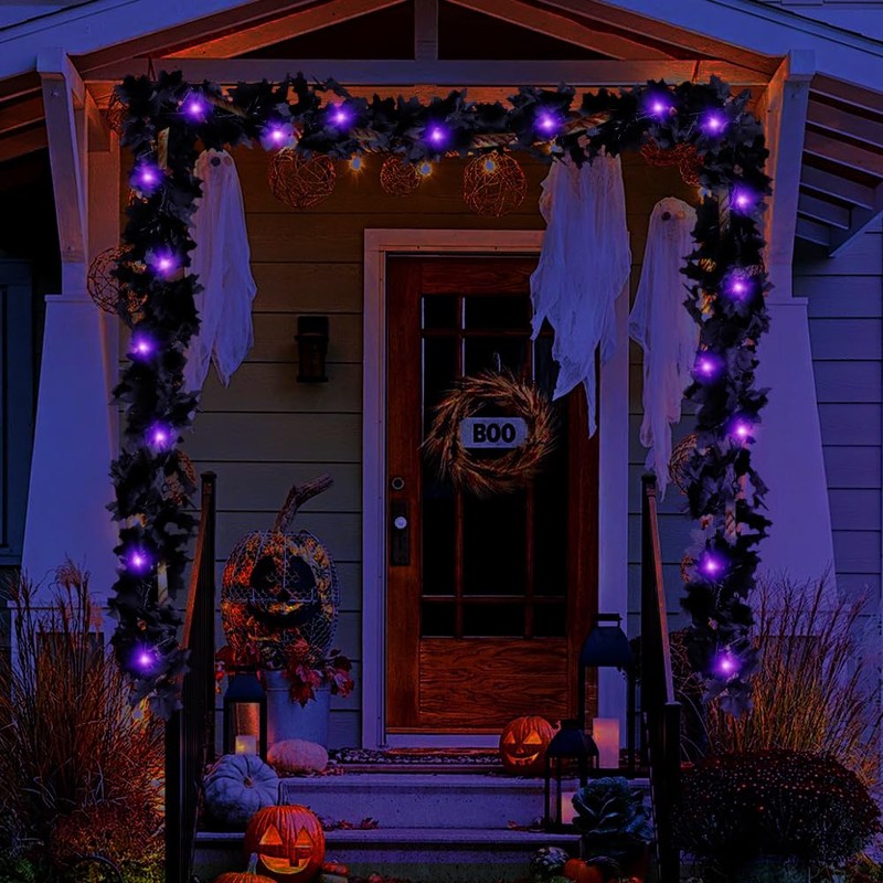 - 2 Pack Artificial Maple Leaves: There are 2 pack maple leaf hangings, 2 LED purple lights and 2 hooks in total. Each maple leaf garland is approximately 5.7 feet, total length is about 11.4 feet. All black makes these autumn hanging vines full of Halloween atmosphere.