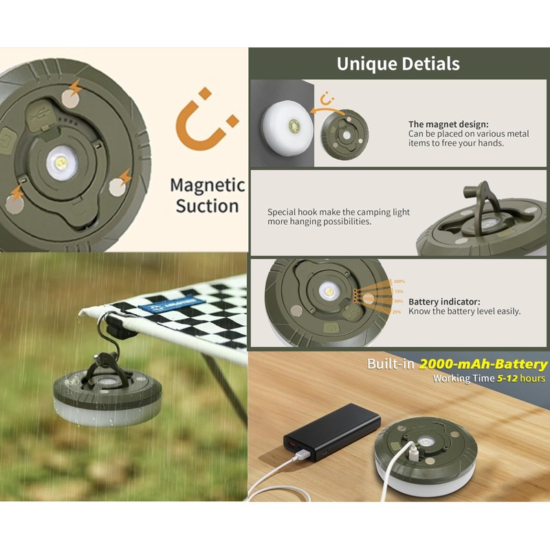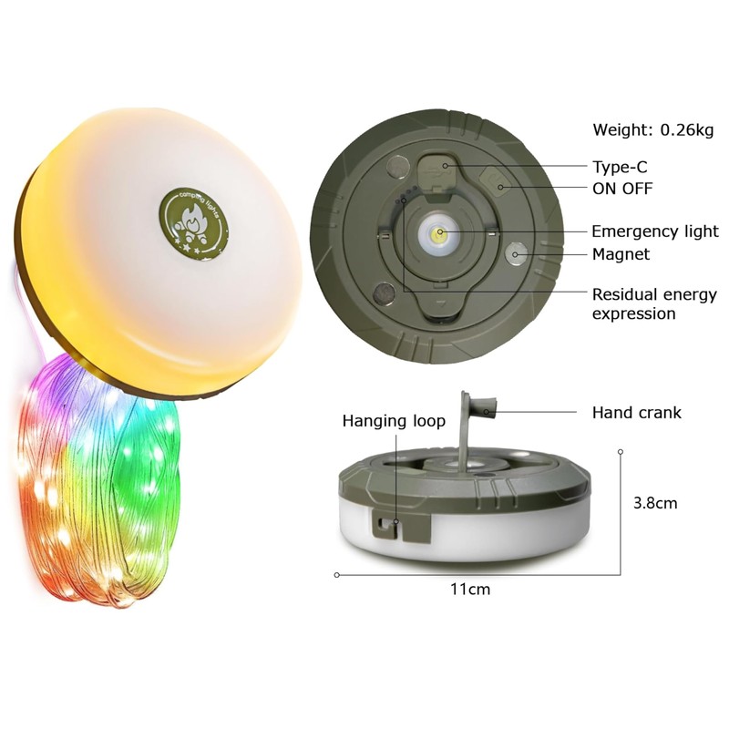 - 【Easy to Store and Portable】The camping lights string can be easily stored by quickly twisting the handle, taking less than 20 seconds. Weighing only 220 grams and with a compact design (diameter: 5.5 cm, height: 2 cm), it is lightweight and portable, fitting easily into a backpack to accompany your journey. Additionally, three magnets on the base allow you to attach this LED camping light to metal surfaces, such as bikes, cars, or tent poles.