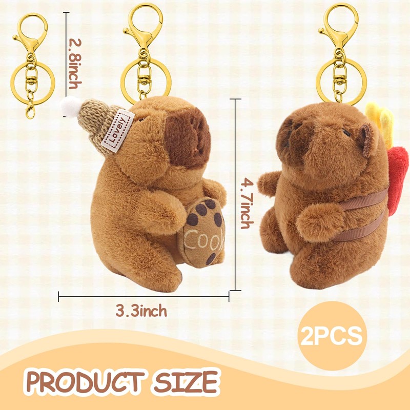 - 【Adorable Designs】 Enjoy the delightful charm of the capybara plush keychain! The set includes 2 unique pieces with detailed, attractive designs that appeal to fans of lifelike animal figures.(Hat&French fries backpack)