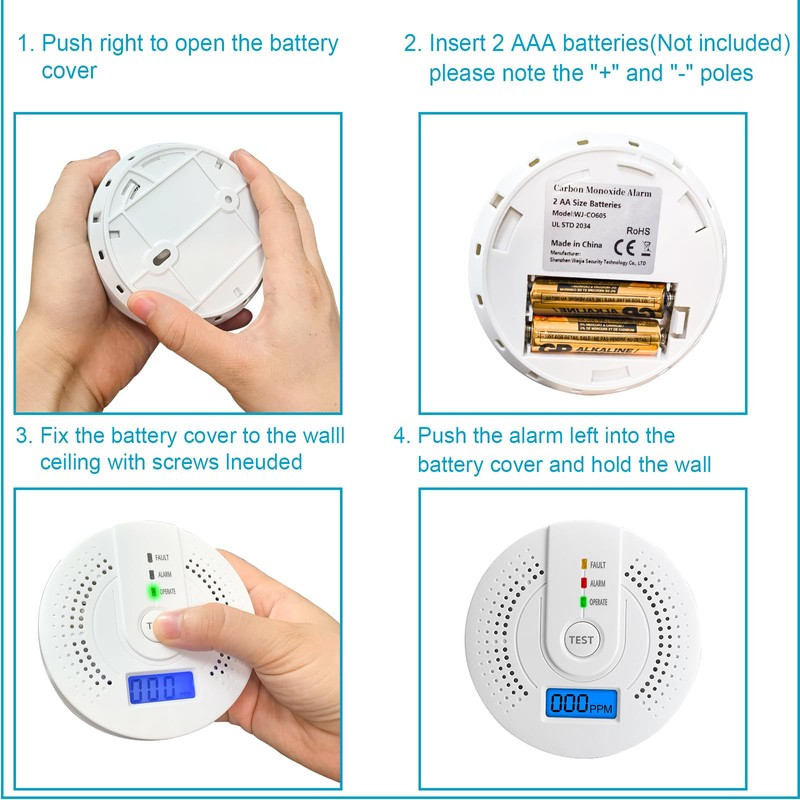 - Easy Installation: Our carbon monoxide detector provides continuous monitoring of CO levels, ensuring the safety of your family. No need for wiring, just insert 2 AA batteries (not included) and it's ready to detect, even during power failures.