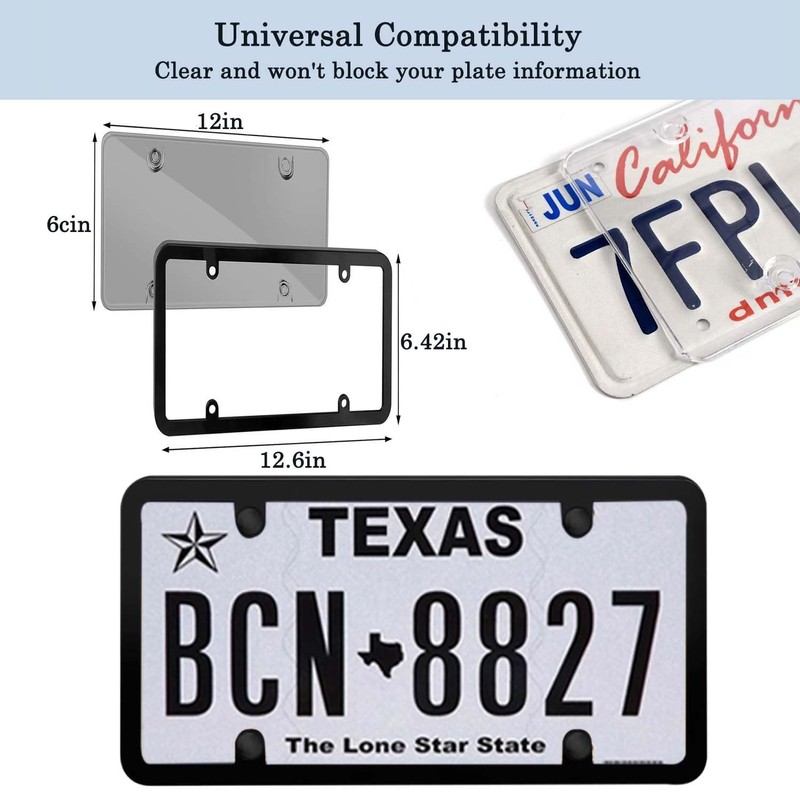 - 【Universal Size】The tag cover for thin license plate is standard sized of 12.2 x 6.2 inch fit for standard US/Canada license plate. This license plate cover with plastic frame does not cover the registration sticker on the license plate, allow you to legally drive on the road and say no to ticket.