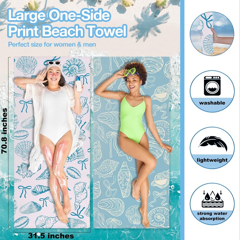 2 Pack Coastal Ocean Starfish Sea Shell Coquette Bow Pattern Beach Towel Microfiber Thin Lightweight Quick Dry Oversized Swim Towels Beach Accessories Necessities for Pool Camping Travel 32x71 inch