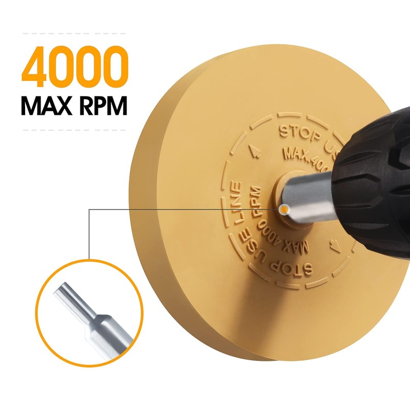 - Note to Use: Sticker remover can molded rubber medium density drill attachment tool with a stop use line; For use with electric drill with maximum 4,000 RPM (best results between 1,500 and 3,000) ( Not recommend for use on Plastic or Lacquer coatings)