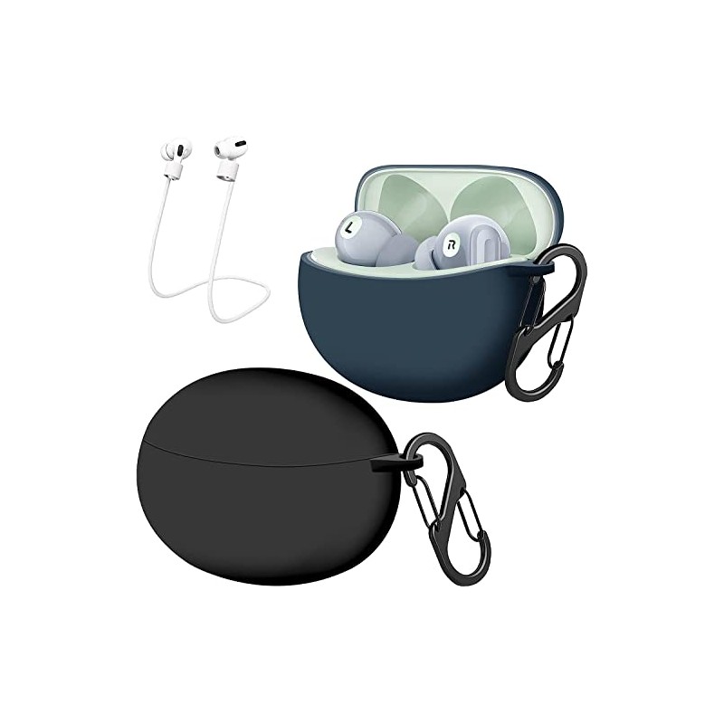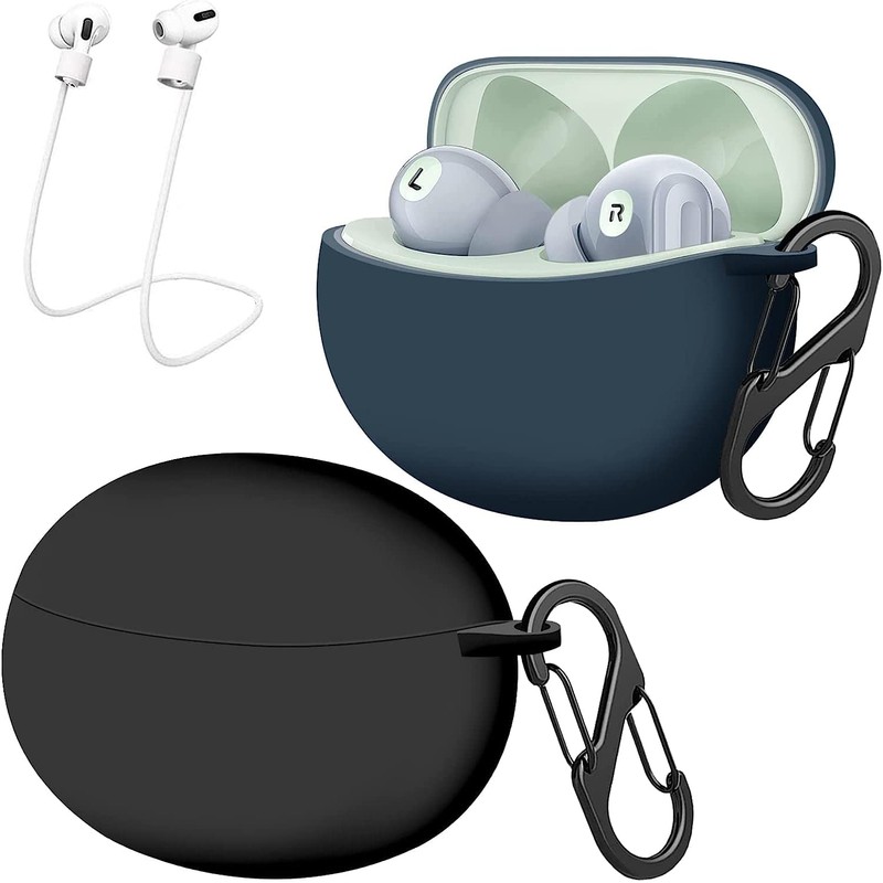 [2-Pack] easyBee Hülle Kompatibel mit realme Buds Air 3 Neo, mit 2 Karabiner 2 Anti-Verlust-Gurte, Flüssiges Silikon Case Ultradünn Stoßfest Schutzhülle Bluetooth Kopfhörer Tasche - Schwarz Blau