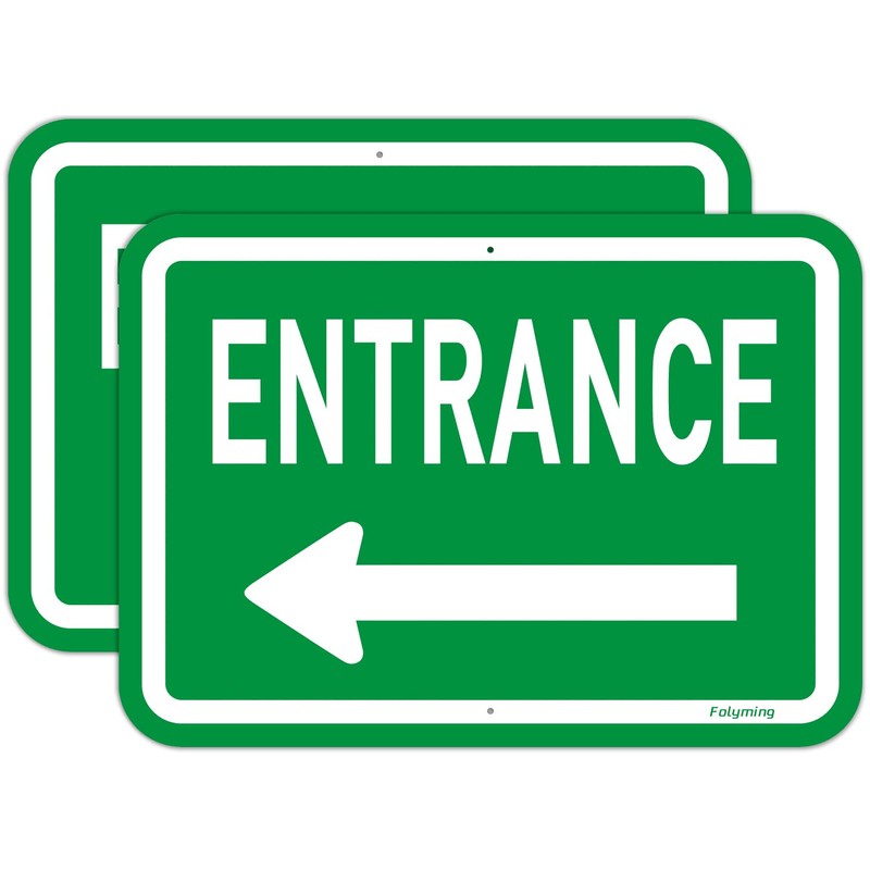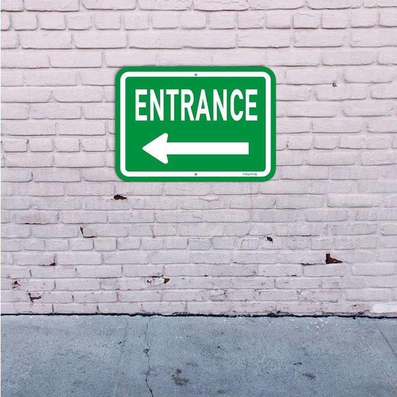 - "Entrance with Left Arrow" sign, Clearly visible Green and White lettering design is sure to catch the attention of people. reminding drivers of the direction of the entrance to avoid going wrong.