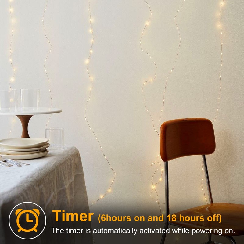 - Auto Timer: When you turn on fairy lights, the lights will automatically turn on for 6 hours and then turn off for the next 18 hours, allowing you to enjoy hassle-free lighting every day. No more worrying about remembering to turn them on or off!