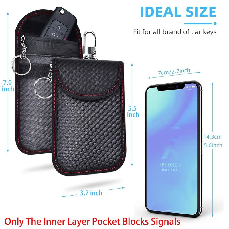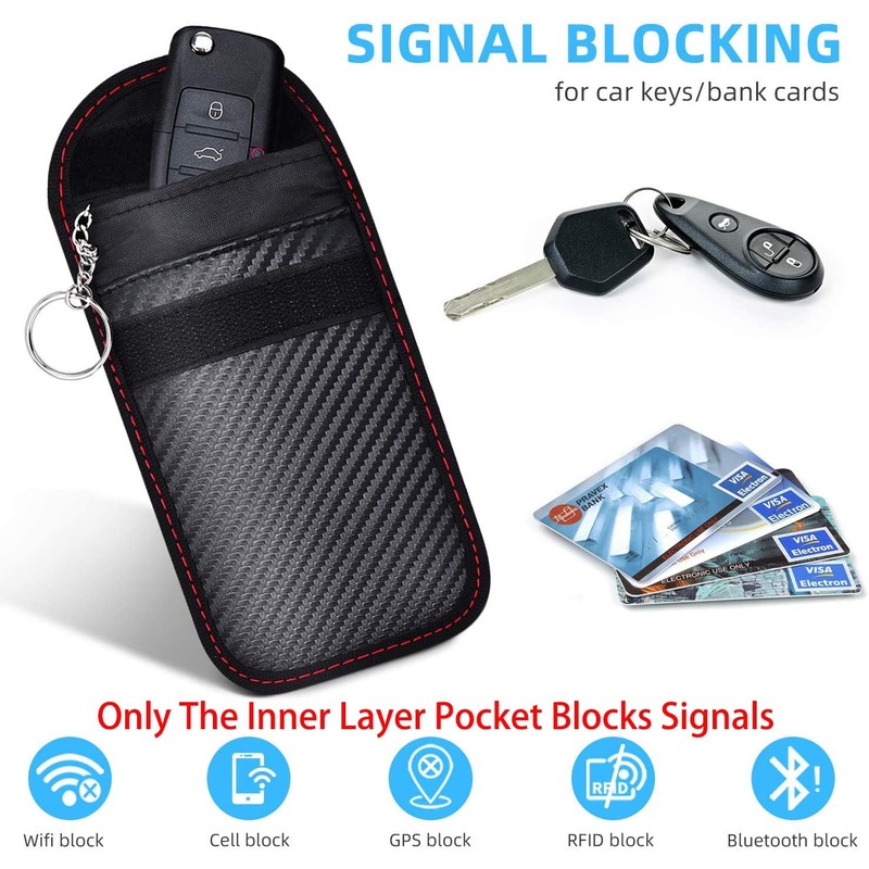 - Why You May Need One? - Get your car protected. This faraday bag provides a complete signal blocker for your vehicle key fob. This prevents thieves from picking up and relaying signals from your key, to shield against break-ins and keyless ignition theft, the bag can block 100% RFID, WI-FI, NFC, KEYS, MOBILE, BLUETOOTH Lock signals and keep your key safe.