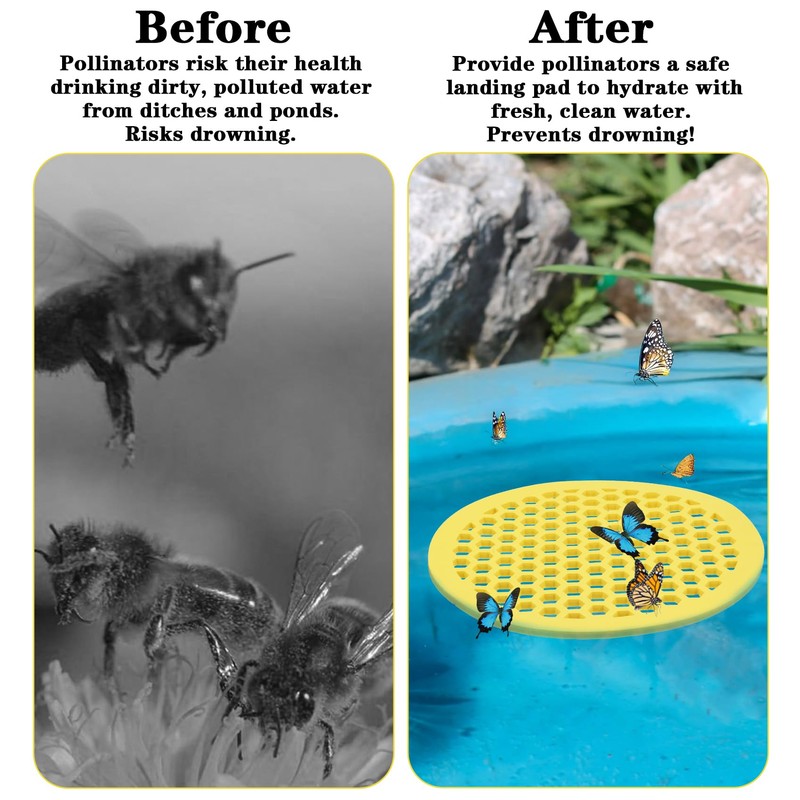 - Bee Island Design - Our floating bee station features a honeycomb-textured surface with flower and round shapes, offering secure landing spots for bees and butterflies while adding vibrant yellow charm to your garde