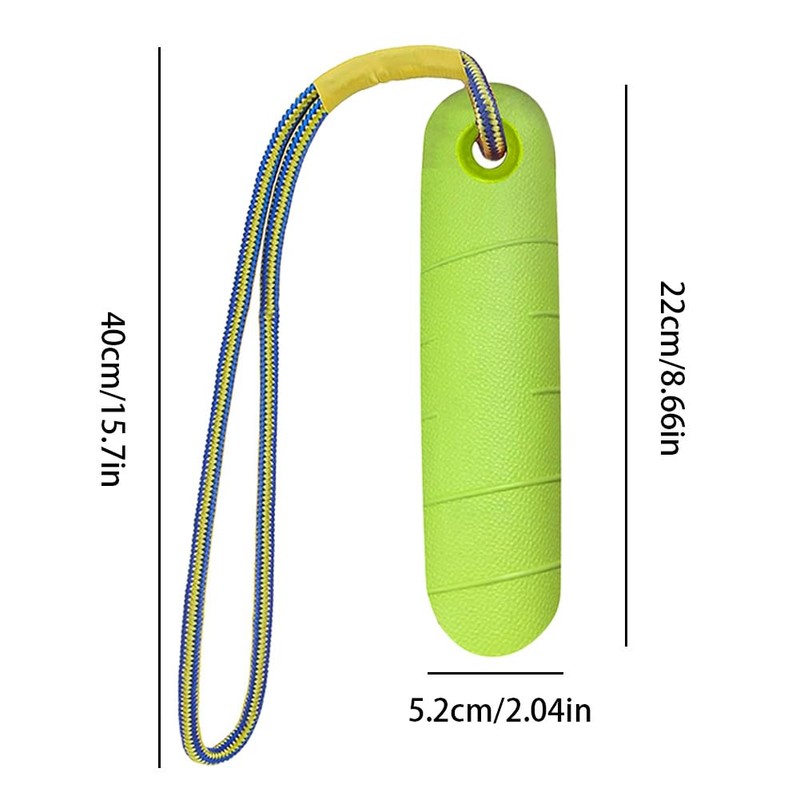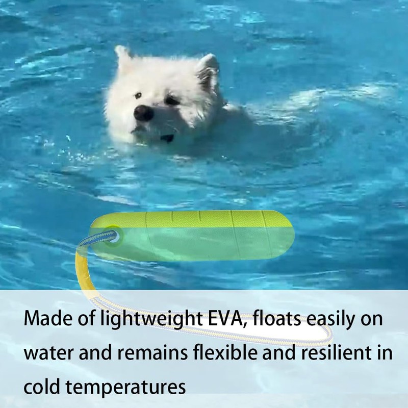 - Dog Toy Design - The overall shape of the dog pool float toys is long and cylindrical, which will not hurt the dog's mouth. The uneven surface and lines on the dog water toy body increase the friction and make it easy for the dog to pick it up. Equipped with a long enough rope to meet the needs of interactive training. It should be noted that due to the special material, long-term chewing can damage this toy, minor damage won't break the toy to the point of being unusable.