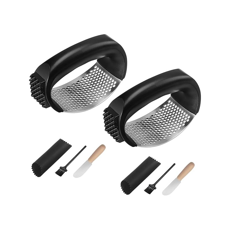 2 Pack Garlic Press Rocker Set – Innovative Stainless Steel Garlic Mincer & Crusher with 2 Peelers, 2 Scrapers, and 2 Brushes for Effortless Garlic Prep | Complete Garlic Tool Kit (BLACK)