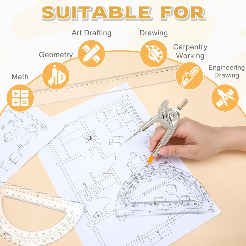 • Widely Used: this exquisite compass drawing tool is widely used in various fields, including mathematics, engineering, carpentry, arts, and drawing. Whether you're a student, teachers, architects, engineers, mathematicians, artists, or a designers, this practical and multifunctional set helps you get the job done quickly and easily