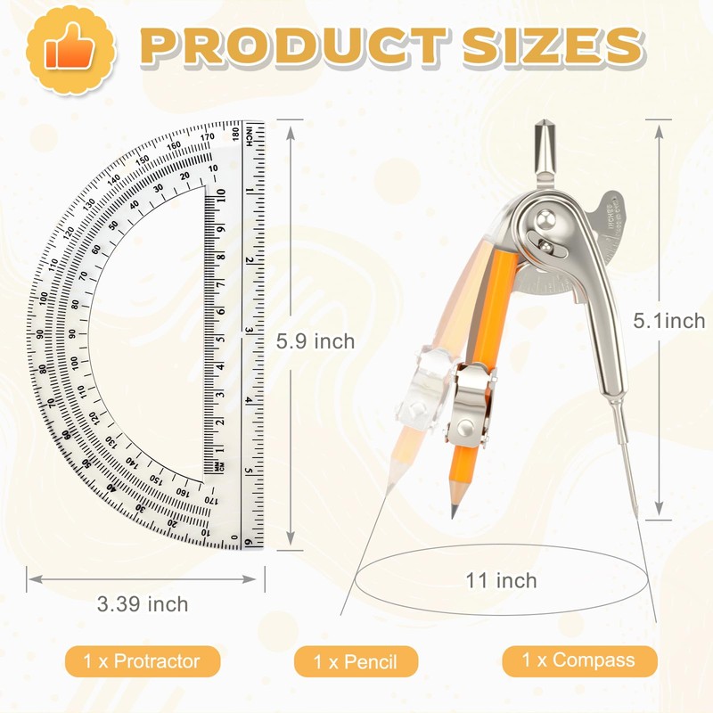 • Appropriate Size: each metal compass is 5.1 inches long and can draw a circle with a diameter of up to 11 inches, or various circles can be drawn as needed; The plastic protractor has a diameter of 6 inches and a range of 0-180 degrees; These math compass and protractor set are ideal for school projects, mathematical geometry, and artistic architectural drawing, helping you quickly complete your work