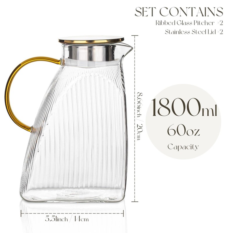 - 2-Pack Large 60OZ Pitchers – Each 1800ML glass water pitcheroffers big capacity for parties, fridge storage, or everyday use—ideal for fruit-infused drinks and beverages.