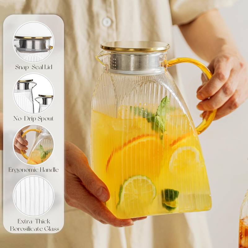- Premium Vertical Stripe Glass Design – Elegant ribbed borosilicate glass pitcher with a wide mouth and yellow handle, combining style & durability for iced tea, lemonade, or infused water.