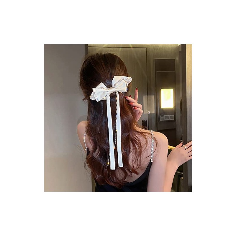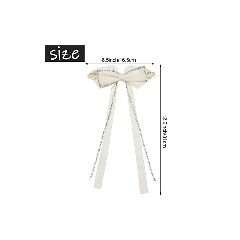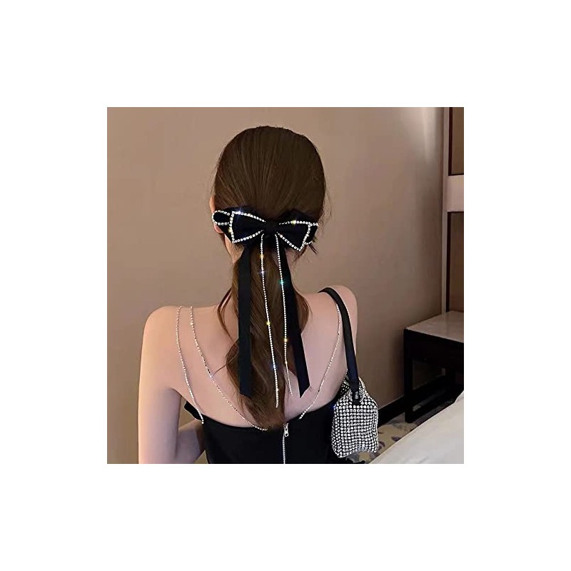 2 PACK Hair Bows Sparkly Rhinestone Tassel Hair Clips Barrettes Bowknot with Long Brocade Tassel Ribbon Claw Hair Accessories for Women and Girls (Black and White)