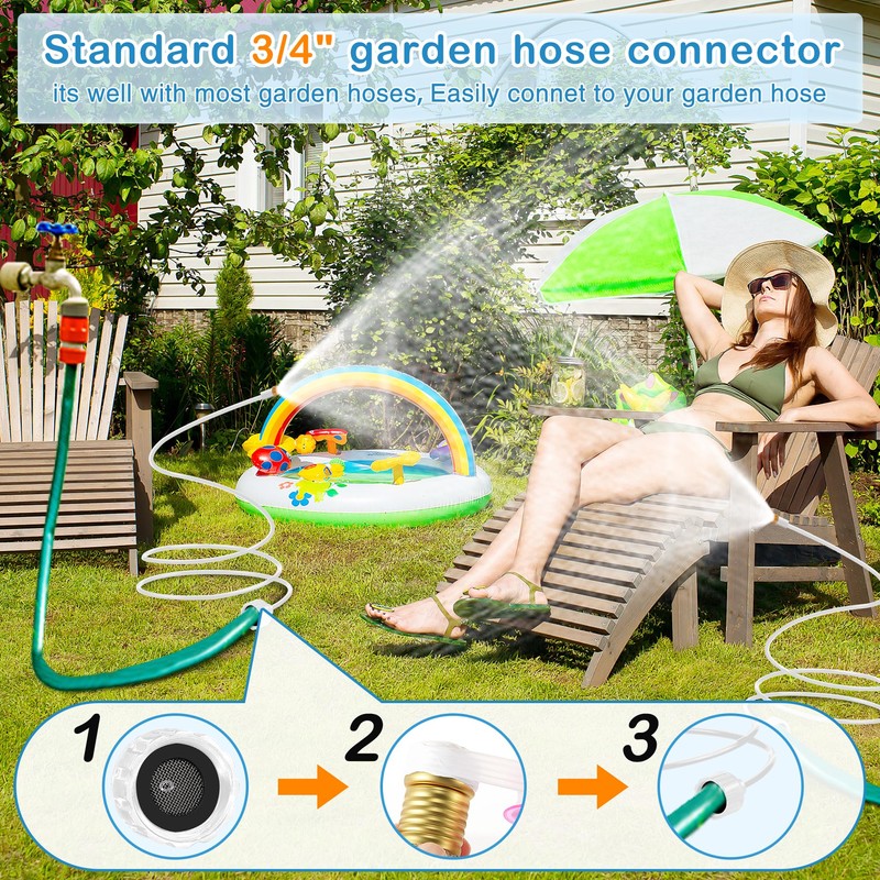 • 🏡Easy Garden Hose Connection: the water misters for cooling outdoor is with a standard 3/4" garden hose connector, making mister easy to connect to your garden hose; Simply wrap the sealing tape around the garden hose connector's threads, screw the hose into the misting hose connector, turn on the faucet, and start misting; No complicated installation process required!
