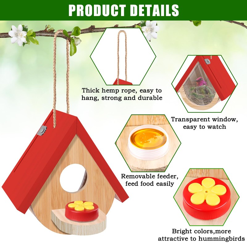 2 Pack Hummingbird Houses with Feeder, Wooden Hanging Bird House Outside, Window Birdhouse for Viewing Inside with Hemp Ropes for Bluebird Finch Chickadee Nesting