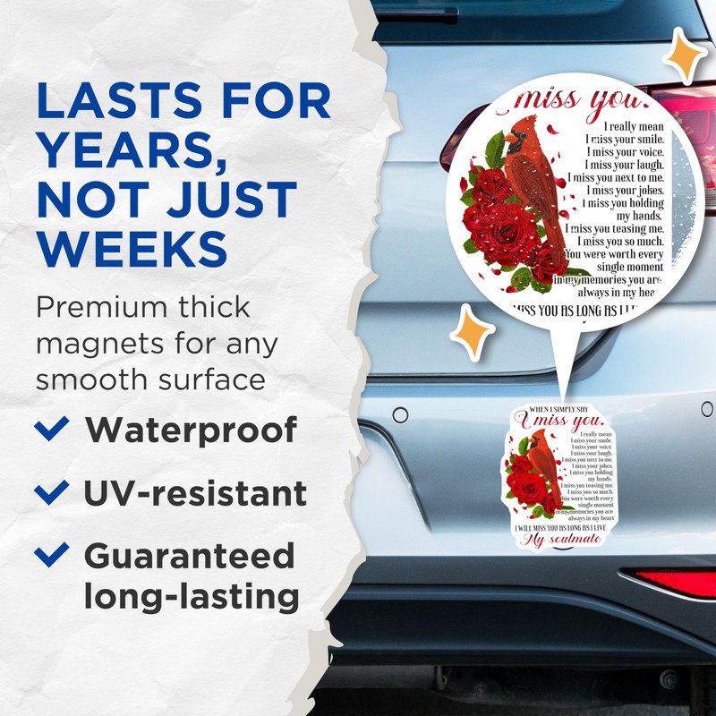 (2 Pack) I Miss You Magnets - Cardinal Bird - Romantic Quote - Sentimental Keepsake - Red Roses Design - Soulmate Message - 5" On Longest Side - for Cars, Fridges, Toolboxes - Made in USA - MAG6118