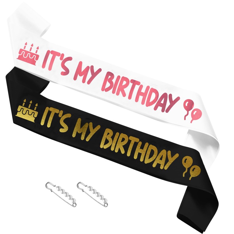 2 Pack It's My Birthday Sash for Women, Birthday Women Decorations, Birthday Sash, Black and White Sashes with Gold and Rose Gold Writing.