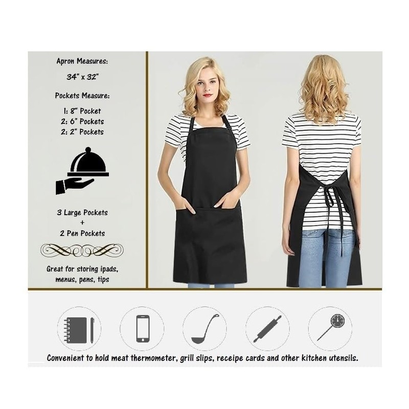 - 💠【FEATURE 5 POCKETS】– With three practical large pockets and two pen pockets, this apron is extremely versatile and will free up your hands. This fundamental cooking and serving essential is perfect for cooking, grilling, picnics, parties, BBQ, camping and more. Apart from cooking, the apron gives great protection while cleaning, painting, serving, industrial usage and many other activities. It has room to keep all accessories necessary for your job handy.