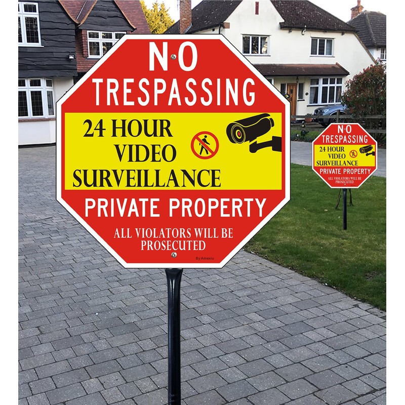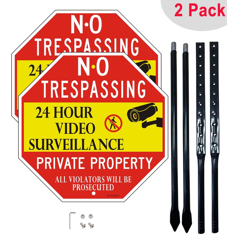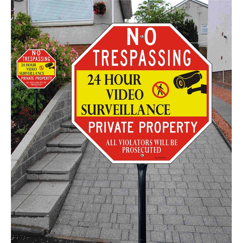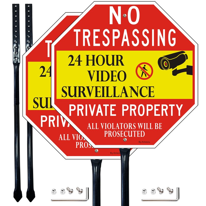2 Pack Large No Trespassing Sign Private Property Sign with 36" Metal Stake - 12 x 12 Inches 24 Hour Video Surveillance Signs, Rust-Free& Fade Resistant