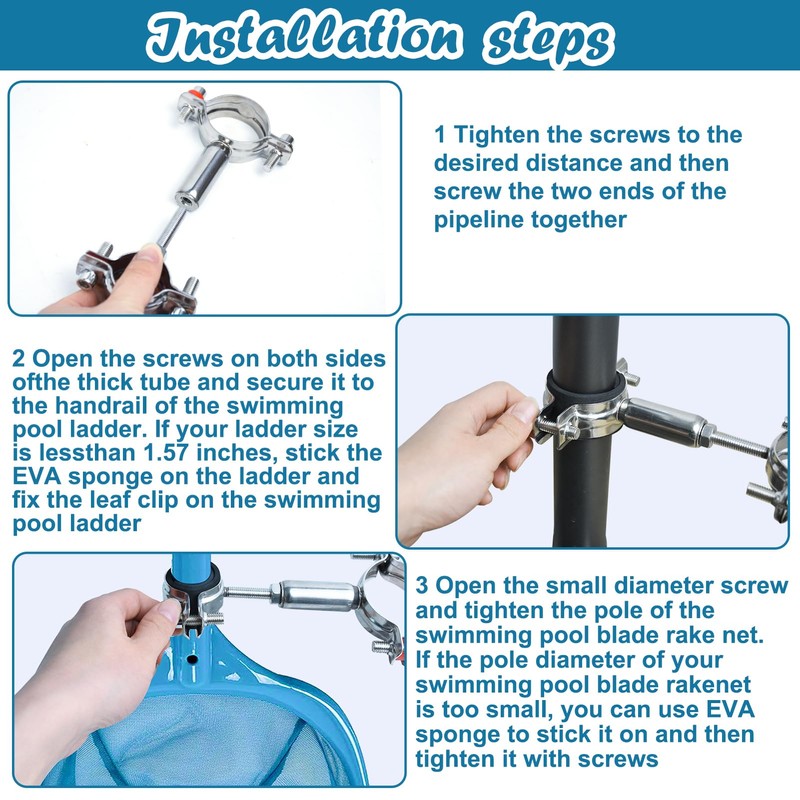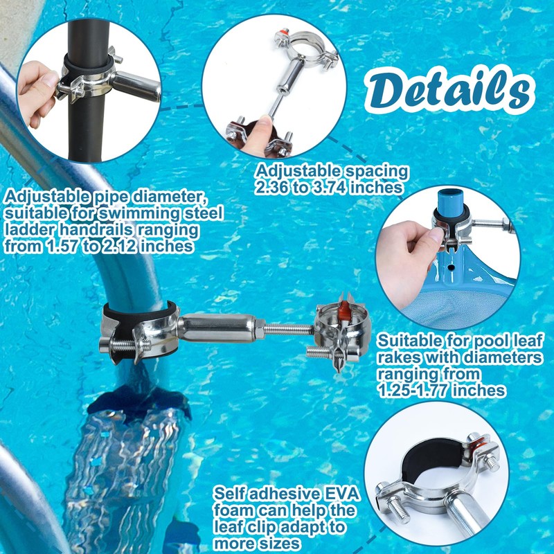 - Multifunctional Compatibility: Compatible with most above-ground pool skimming nets and pool stairs. Pool skimmer clip attachment is suitable for swimming steel ladder handrails rang from1.57 to 2.12 Inch. If it is a thinner steel ladder, you can try using a sponge to wrap the pipe, and then adjust the size by screws until it fits. 304 stainless steel Leaf net skimmer clip is suitable for pool leaf rakes with diameters rang from 1.25-1.77 Inch.