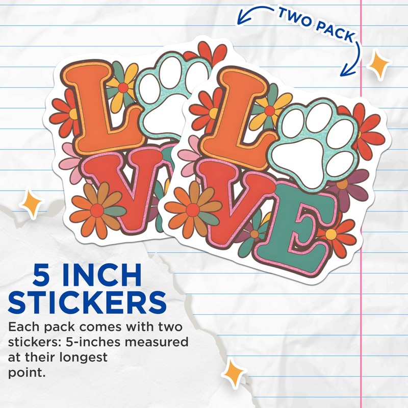 (2 Pack) Love Paw Print Stickers - Dog Lover Stickers - Cute Floral Animal Decals - 5" On Longest Side - Sticks to Smooth Flat Surfaces - Made in USA - BMCS7045