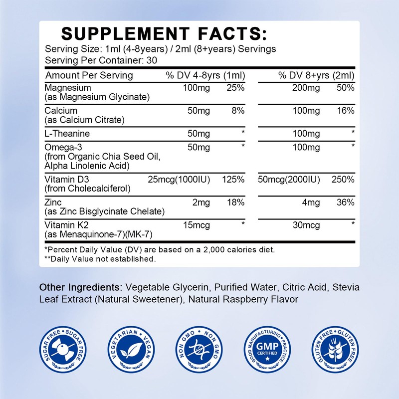 - RELAXATION & RESTFUL SLEEP: Hovika kids magnesium glycinate liquid is specially designed to support children's relaxation and restful sleep. With a blend of Magnesium Glycinate, L-Theanine, and Omega-3, it helps promote calmness, muscle relaxation, and a balanced mood, making bedtime easier. Enriched with Vitamin D3 and Zinc, it also supports immune function, helping kids wake up refreshed
