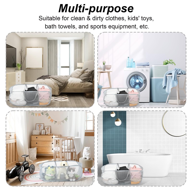 - Premium 2-Pack Set: Get double the value with our mesh pop up laundry hamper duo, featuring sturdy 3-compartment dividers for effortless sorting of lights, darks, and colors. Perfect as popup laundry hampers for shared spaces or multi-task laundry needs.