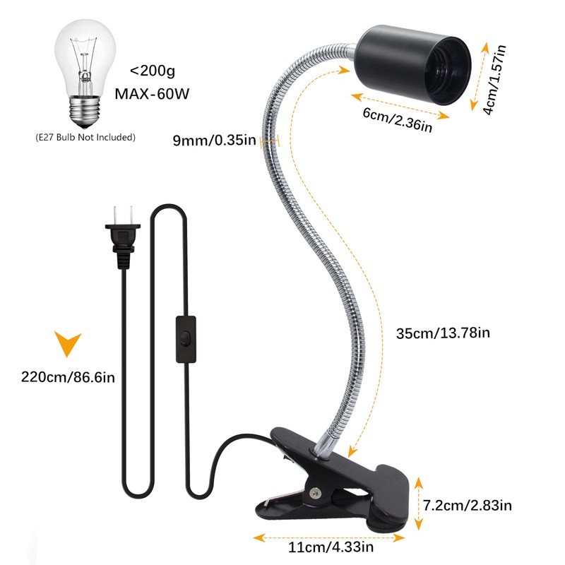 - Flexible Gooseneck Clip Light: 9MM*35CM metal gooseneck clip light, better support the bulb (Reminder: recommended to use the bulb below 201 grams), can be adjusted to rotate the metal gooseneck 360 ° to maintain the best angle of lighting. Clamp lamp fixture meet the needs of reading/crawling pets/plants to fill the light of multiple scenes