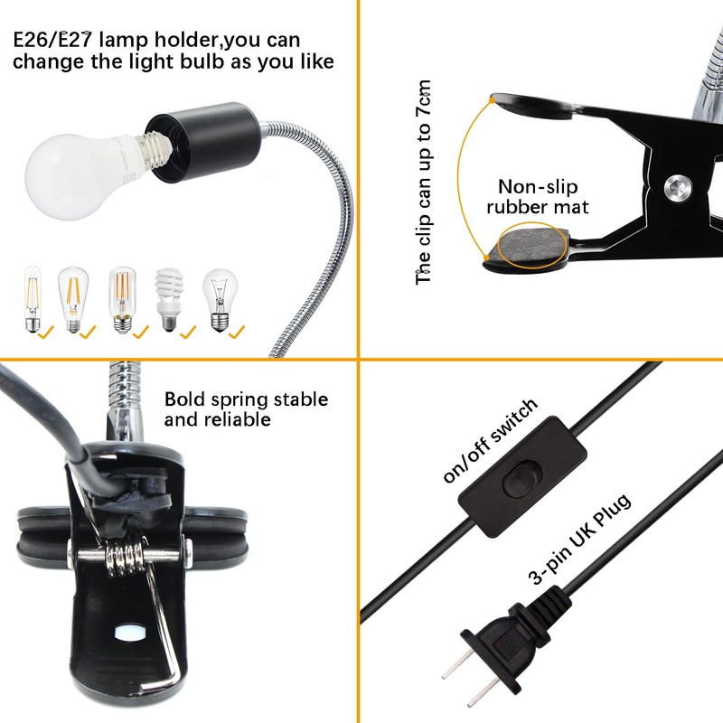 - E26/E27 Clamp Table Lamp: 220cm long cable, no need to extend the cable to reach the socket for a variety of scenarios, the switch is located 50cm away from the lamp base to easily control the clamp lamp on/off.E26/E27 socket supports standard bulbs (up to 60W), which makes the clamp table lamp more flexible.E26/E27 socket supports standard bulbs (up to 60W), which makes the clip table light more flexible