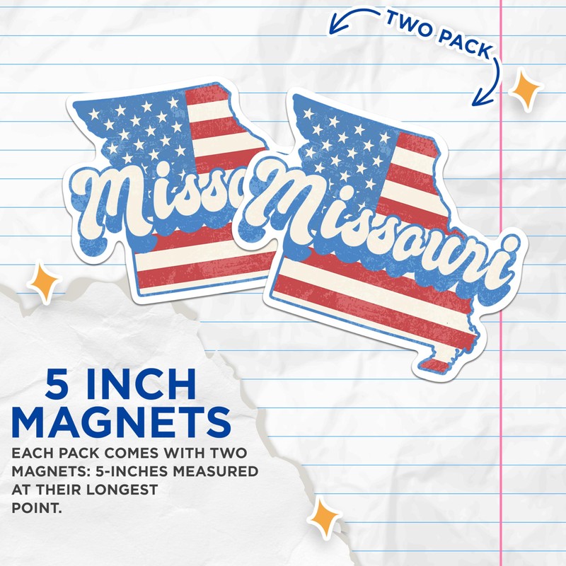 (2 Pack) Missouri State Outline Magnets - MO State Shape with USA Flag - 5" On Longest Side - Premium Magnet - Choose Your State - for Cars, Refrigerators, Toolboxes - Made in USA - MAG1151