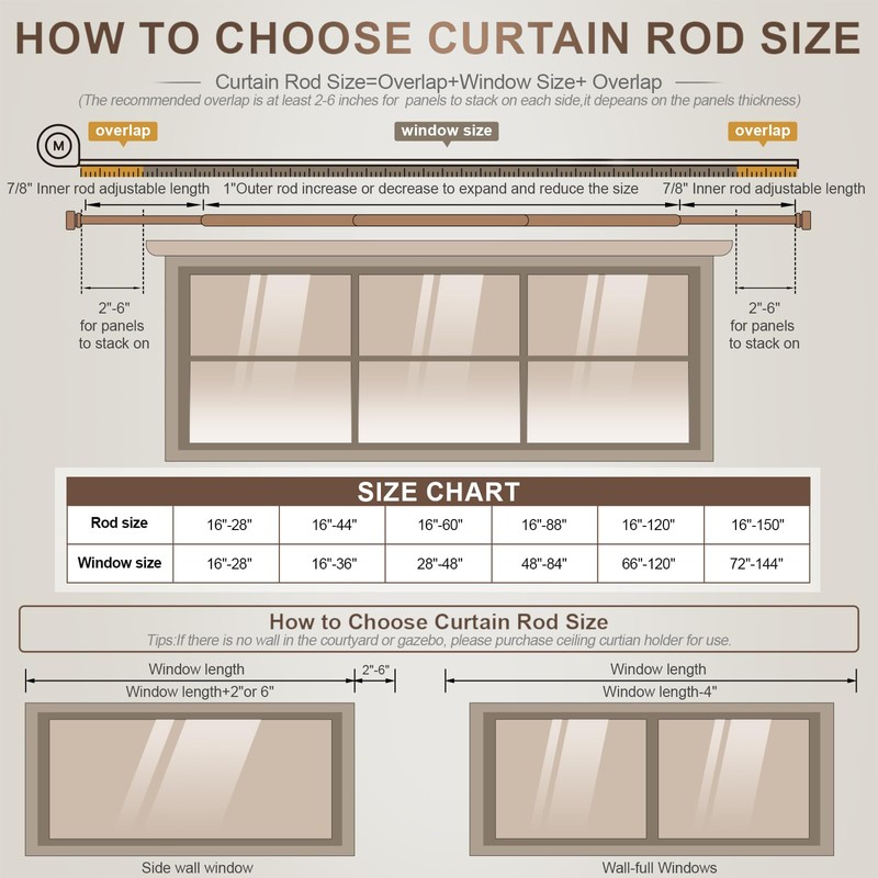 - 【How to Choose a Right Curtain Rod】Please measure your window size(Don't only measure the glass but the entire window frame.) before purchasing to help you choose a right curtain Rod.Curtain Rod Size = Overlap + Window Size + Overlap(The recommended overlap is at least 2-6 inches for panels to stack on each side,it depeans on the panels thickness),so a right curtain rod should be 4-12 inches longer than your window size.If your window is 36 inches, your curtain rod should be 16-60 inches.