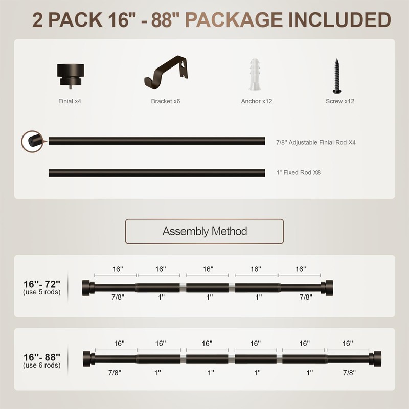 - 【Adjustable Curtain Rods with Brackets】This Brown curtain rods featuring an upgraded telescoping sectional construction, you can freely adjust the size you want by decreasing the number of fixed rods or adjust the inner rod.This curtain rod is adjustable from 16 to 88 inches.16 to 88 is the size of the curtain rod, not the window size. When choosing a curtain rod size,add 4-12 inches to your window size for the best curtain rod size for your window.