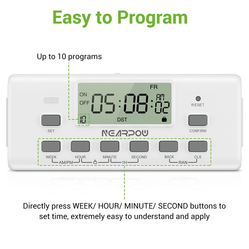 - [Easy to Program] This digital light timer allows extremely convenient and flexible time setting for week, hour, minute and second directly, super easy to understand and apply, fully meet your needs. And the Min setting time is as precise as 1 second.