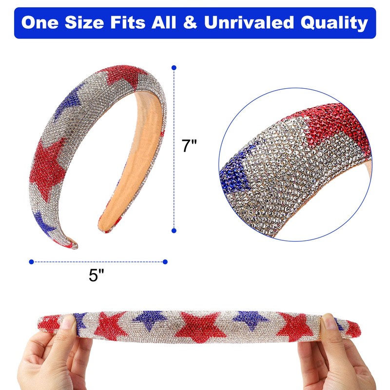 - 【Full-Studded Sparkle Design】 Our patriotic headbands are completely covered in high-density glitter rhinestone, giving off a dazzling shine from every angle. The tight crystal placement ensures long-lasting sparkle without shedding—perfect for anyone who loves that all-day "bling" look.
