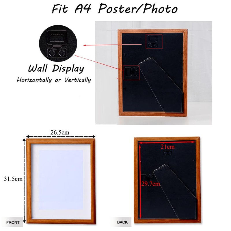 - 2 Ways to Display :Our A4 picture frames display A4 inches photo. With hooks and brackets, the walnut A4 frame supports desktop display and wall mounting. Horizontal or vertical suspension display as you like.Display one frame or many to create a gallery wall.