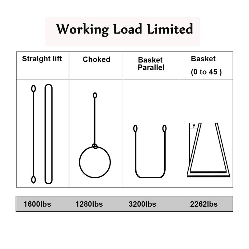 - RATED CAPACITIES: Indusafe Polyester Lifting Straps: Vertical: 1600lbs; Choked: 1280lbs; Basket Parallel: 3200lbs; Basket(0 to 45°): 2262lbs. You can change the load bearing shapes according to your demand.