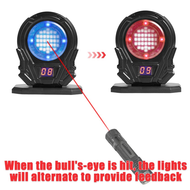 - Discoloration Feedback System: The laser target features alternating red and blue lights around the bullseye, offering real-time visual feedback when hit. You can set it on any flat surface, hang it on a wall, or attach it to steel surfaces using the built-in rear magnets for flexible training options.