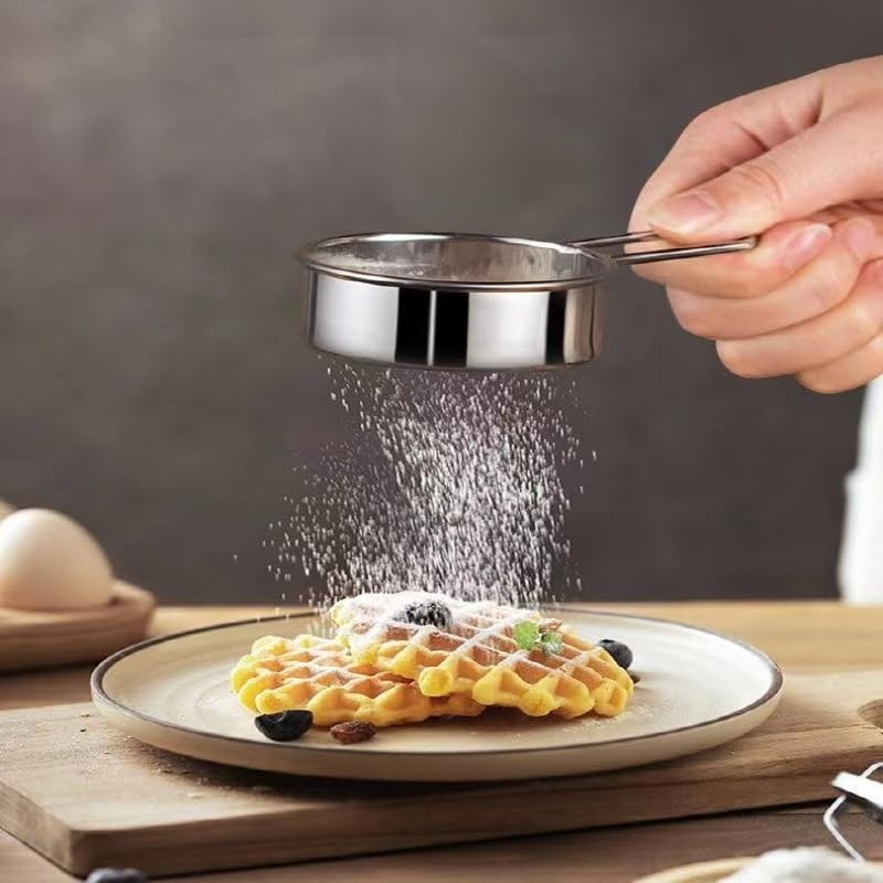 Flour Sifter for Baking - 2 Pack Powdered Sugar Sifter - Mini Small Drainer for Baking, Powder, Sugar and Coffee Pastas Tea Strainer【Durable Stainless Steel】 This small strainer is crafted with high-quality stainless steel that undergoes a refining process, ensuring its durability and resistance to rust. Its compact size makes it ideal for everyday use in the kitchen. With a round fine mesh sifter and a tough long handle, it offers a confident grip, allowing you to strain with ease and convenience.