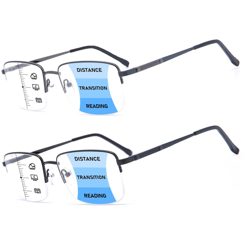 - three levels of vision - Progressive multifocus glasses for all your need. Top part is half-power magnification for walking, shopping. The middle part is slightly reduced power magnification for working on computer, watching TV, etc.The bottom part of the lens is full-power.