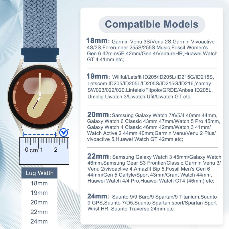 20mm watch bands are compatible with smart watches with 20mm wide lugs, such as Samsung Galaxy Watch7/6/5/4 40mm 44mm, Galaxy Watch 6 Classic 43mm 47mm/Watch 5 Pro 45mm, Galaxy Watch 4 Classic 46mm 42mm etc.