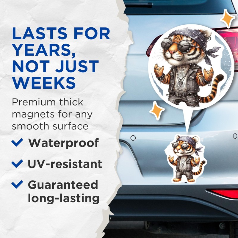 (2 Pack) Rocker Tiger Magnets - Cool Cat Art - Unique Kitchen Fridge Decor - 5" On Longest Side - Sticks to Smooth Flat Surfaces - Made in USA - MAG10678